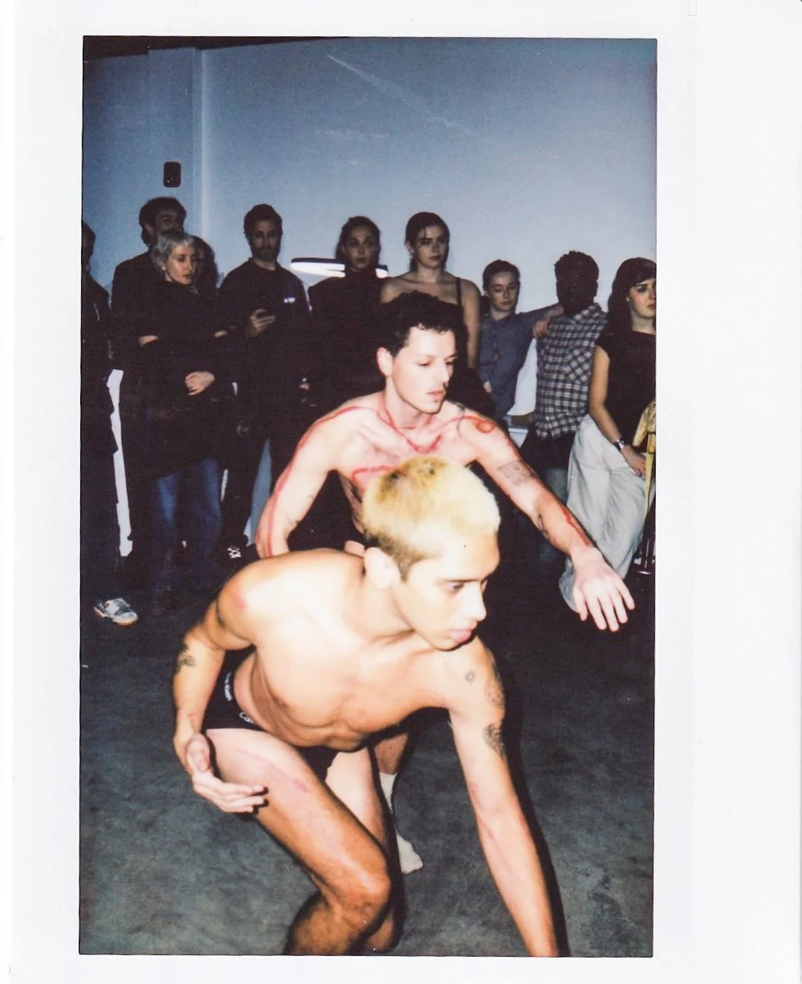 On the exhibition’s opening night, this fantasy came alive in a performance art piece, co-choreographed by Samuel Schler and Nicholas Lamaina and assisted by Ekko Greenbaum. Featuring seven dancers dressed in matching Calvin Klein sets, the piece is staged around Minimal Gallery’s tattoo chairs as lipstick is used to trace the dancer’s moving bodies. Titled, Draw The Line, the piece filled the gallery with the rhythmic releases of dance and complicated the line between audience and performer. Amidst intertwined bodies and a rapt audience, Draw The Line was able to suspend Minimal Gallery in a moment of wonder.